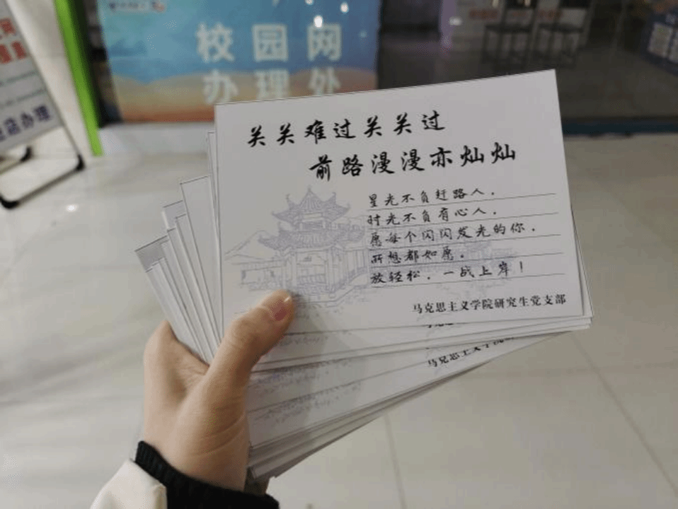 活动前,马克思主义学院研究生党支部一同为考研学子设计定制了明信片,背面是学校经典风景照,正面是考研祝福语——“关关难过关关过,前路漫漫亦灿灿。星光不负赶路人,时光不负有心人,愿每个闪闪发光的你,所愿都所想。放经松,一成上岸!”,祝愿考生们能够金榜题名,顺利上岸。