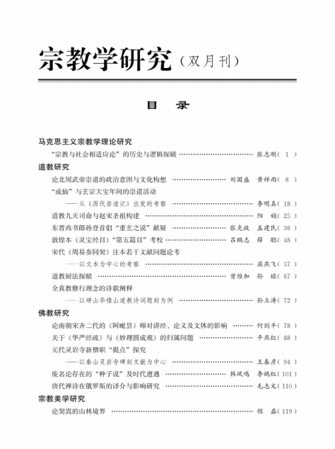 《宗教学研究》是由四川大学道教与宗教文化研究所主办的宗教学专业学术双月刊,创刊于1982年,是全国高校唯一公开出版发行的宗教学专业学术期刊。系国家社科基金资助期刊,CSSCI来源期刊,中国人文社会科学核心期刊,全国中文核心期刊。该刊注重马克思主义宗教学理论研究,突出道教研究特色,兼顾宗教学理论、佛教、基督宗教、中国少数民族宗教、民间信仰、宗教美学等研究。