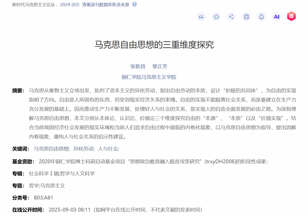 该研究不仅深化了对马克思主义经典理论的理解,也为个体在社会转型过程中如何处理个人与社会、自由与发展之间的关系提供了重要的理论参考和实践启示彰显了我院师生立足现实、回应时代关切的理论自信与学术担当,为我们在新时代深刻理解并追求人的自由全面发展提供了有价值的理论参考。