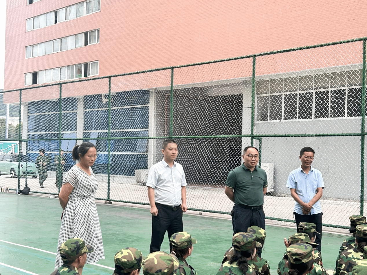 9月18日下午,我院党委书记张江林、副书记李兢、副院长张新昌以及24级思政班班主任杨伟老师一同前往训练场地看望正在进行军训的新同学,给同学们加油鼓劲。
