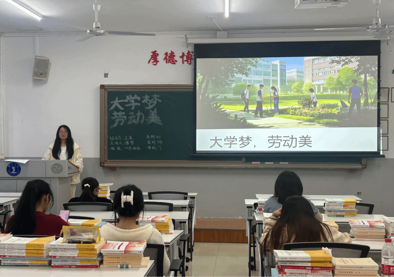 班会伊始,主讲人强调,梦想是人生重要的目标指引,而劳动则是实现梦想的基石。会上,主讲人分享身边优秀校友的故事,阐述了大学生树立梦想对于个人成长的重要性,以及劳动在追求梦想过程中所发挥的关键作用,引发了同学们的强烈共鸣。随后,互动环节中多位同学结合自身生活实际,讲述劳动带来的收获与感悟,积极分享了自己心中的大学梦和为实现梦想将付出的劳动计划。为了让同学们更直观地感受劳动之美,班会还组织观看了劳动模范的事迹视频。视频中劳动者们在各自岗位上辛勤付出、追求卓越的精神,深深打动了每一位同学。观看结束后,同学们纷纷表示,要以这些劳动模范为榜样,在日常学习生活中积极劳动,锤炼自身品质。