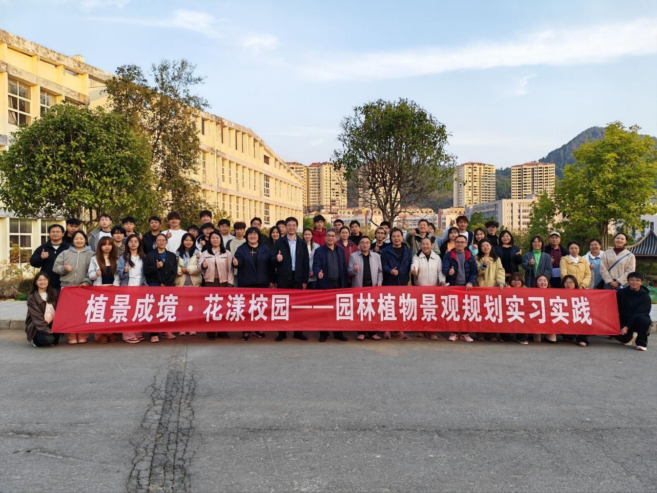 此次花境设计建造,是课程教学的一次创新探索。课程通过户外实地调研、设计方案、施工落地等环节,引导学生直面真实场地与植物特性,在设计图纸与建成场景之间构建实践桥梁,全方位提升学生的设计思维与实践能力。项目以校园主干道一侧绿带为基址,学生以小组形式协同合作,打造出以多年生宿根植物为主,搭配灌木、少量一二年生花卉及园林小品的景观群落,兼具专业高度与观赏价值。活动得到了农林工程与规划学院、后勤处、教务处及铜仁梵花商贸有限公司等单位的大力支持,为实践教学的顺利开展提供了坚实保障。