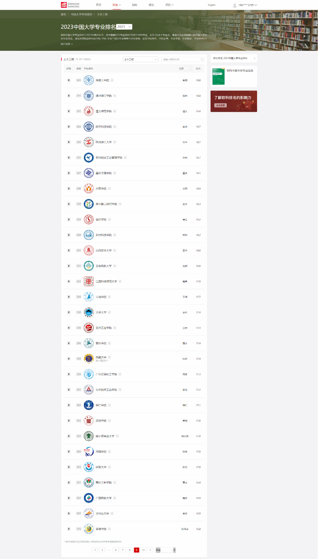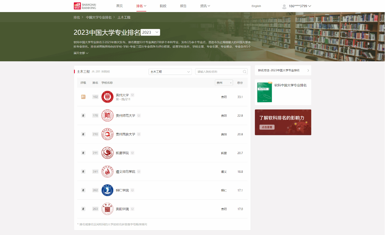 6月15日,高等教育专业评价机构—上海软科教育信息咨询有限公司发布2023年中国大学专业排名,伟德官网土木工程专业在上榜的281所院校中排名262,得分17.1分,贵州省内第6,属B等层次,全国共有572所院校开设土木工程专业。