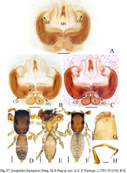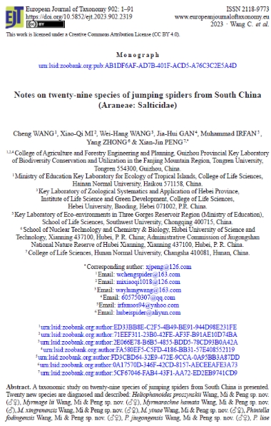 该论文综合形态学和部分分子生物学结果,记述了我国南方29种跳蛛科蜘蛛物种,其中包括新种20种(含以梵净山和佛顶山为模式产地的新种6种:普氏类闪蛛Heliophanoides proszynskii Wang, Mi & Peng, 2023、尹氏蚁蛛Myrmarachne. yinae Wang, Mi & Peng, 2023、佛顶金蝉蛛Phintella fodingensis Wang, Mi & Peng, 2023、亚湖北兜跳蛛Ptocasius subhubeiensis Wang, Mi & Peng, 2023、梵净合跳蛛Synagelides fanjingensis Wang, Mi & Peng, 2023和佛顶射手蛛Toxeus fodingensis Wang, Mi & Peng, 2023)、中国新记录种2种、单性新发现种6种。该论文还修订了1种同物异名,多种错误鉴定,以及提出了3个新组合。