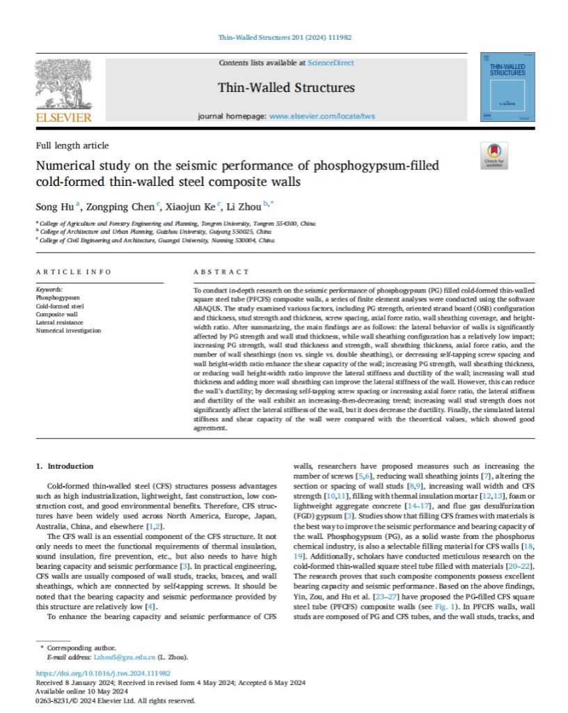 近日,我院胡松博士在《Thin-Walled Structures》发表了题为“Numerical study on the seismic performance of phosphogypsum-filled cold-formed thin-walled steel composite walls”的研究论文。该论文以bv伟德国际1946为第一署名单位。