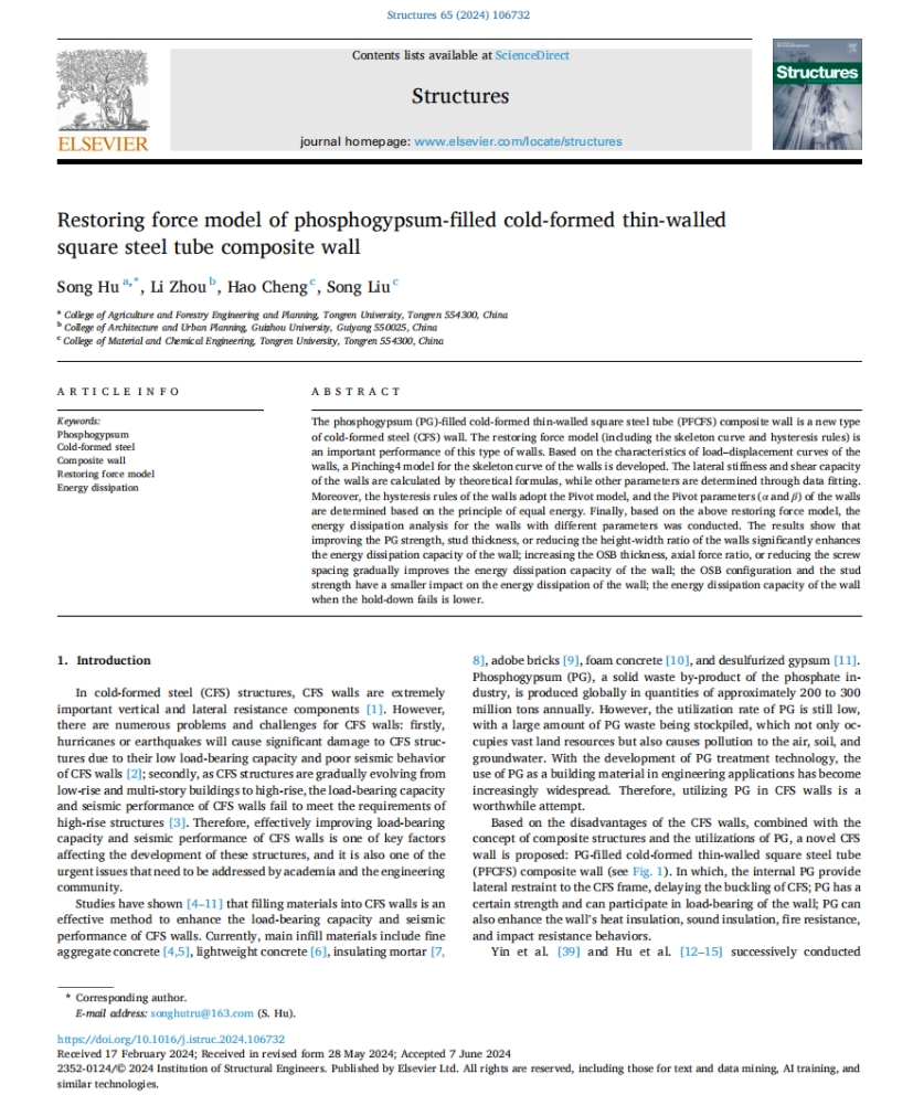 近日,我院胡松博士在《Structures》发表了题为“Restoring force model of phosphogypsum- filled cold- formed thin- walled square steel tube composite wall”的研究论文,bv伟德国际1946为第一署名单位,胡松为第一及通讯作者,合作者为周理(校外)、成昊及刘松。