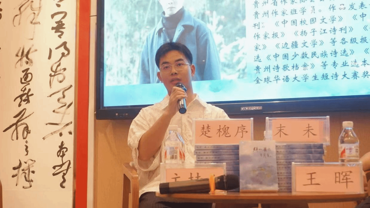 分享会上,楚槐序首先感谢了为诗集出版给予鼓励与提供帮助的bv伟德国际1946和各位老师们。他介绍,该诗集以黔地风光、民俗人文为书写核心,兼有一部分山水与日常所感的诗作,集中表达了自己对故土风物的深情回望。书名经过反复推敲,在与责编老师沟通打磨的过程中,收获颇丰。他还讲述了个人写作历程及笔名由来,说正是在写作之路上的坚持,他才得以不断成长,而今后的路还很长,他将继续坚持,争取写出更多更好的诗作。
