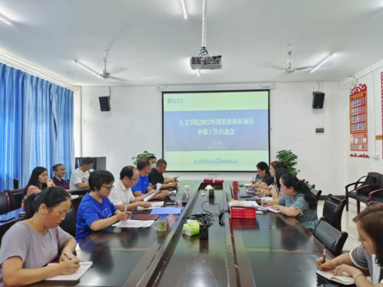 张建刚传达了学校关于2022年国家社科项目申报工作的相关文件和会议精神,总结了2021年人文学院国家级科研项目申报情况,并就我院2022年申报任务作了说明。科研科科长张丽娅解读《人文学院2022年国家级科研项目申报工作方案》,并对具体申报任务作了安排部署。