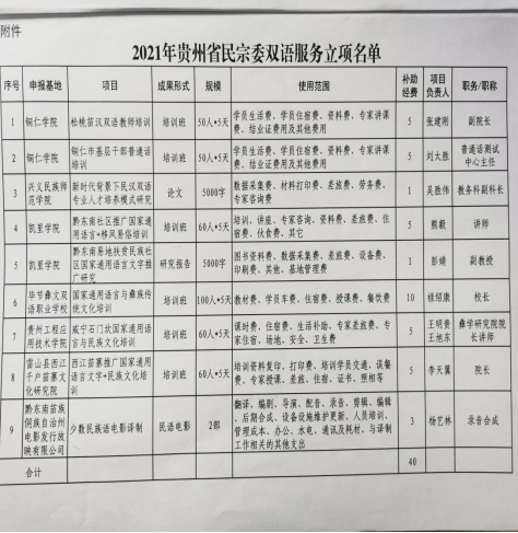 近日,贵州省民族宗教事务委员会下达了2021年省级民族工作项目经费。我院张建刚副教授申报的《松桃苗汉双语教师培训》和刘太胜副教授申报的《铜仁市基层干部普通话培训》各获5万元项目经费;杨春君副教授申报的《石阡历史文献整理与研究》,郭征帆副教授和市管专家汪兴联合申报的《清康熙< 平溪卫志书>整理及平溪卫历史文化研究》各获3万元项目经费。日前,上述经费已全部到账。