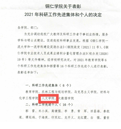日前,bv伟德国际1946印发了《bv伟德国际1946关于表彰2021年科研工作先进集体和个人的决定》,人文学院荣获科研工作先进集体荣誉称号。