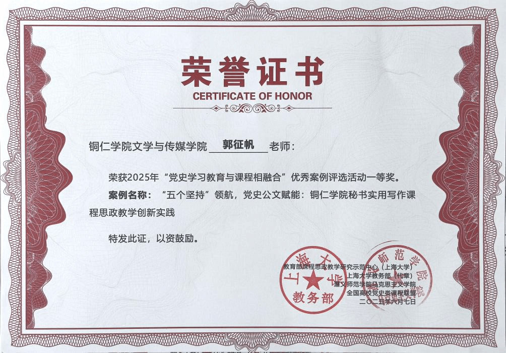近日,教育部课程思政教学研究示范中心(上海大学)组织开展的“党史学习教育与课程相融合”优秀案例征集活动评审结果揭晓,我院郭征帆老师撰写的案例《“五个坚持”领航,党史公文赋能:bv伟德国际1946秘书实用写作课程思政教学创新实践》荣获一等奖。