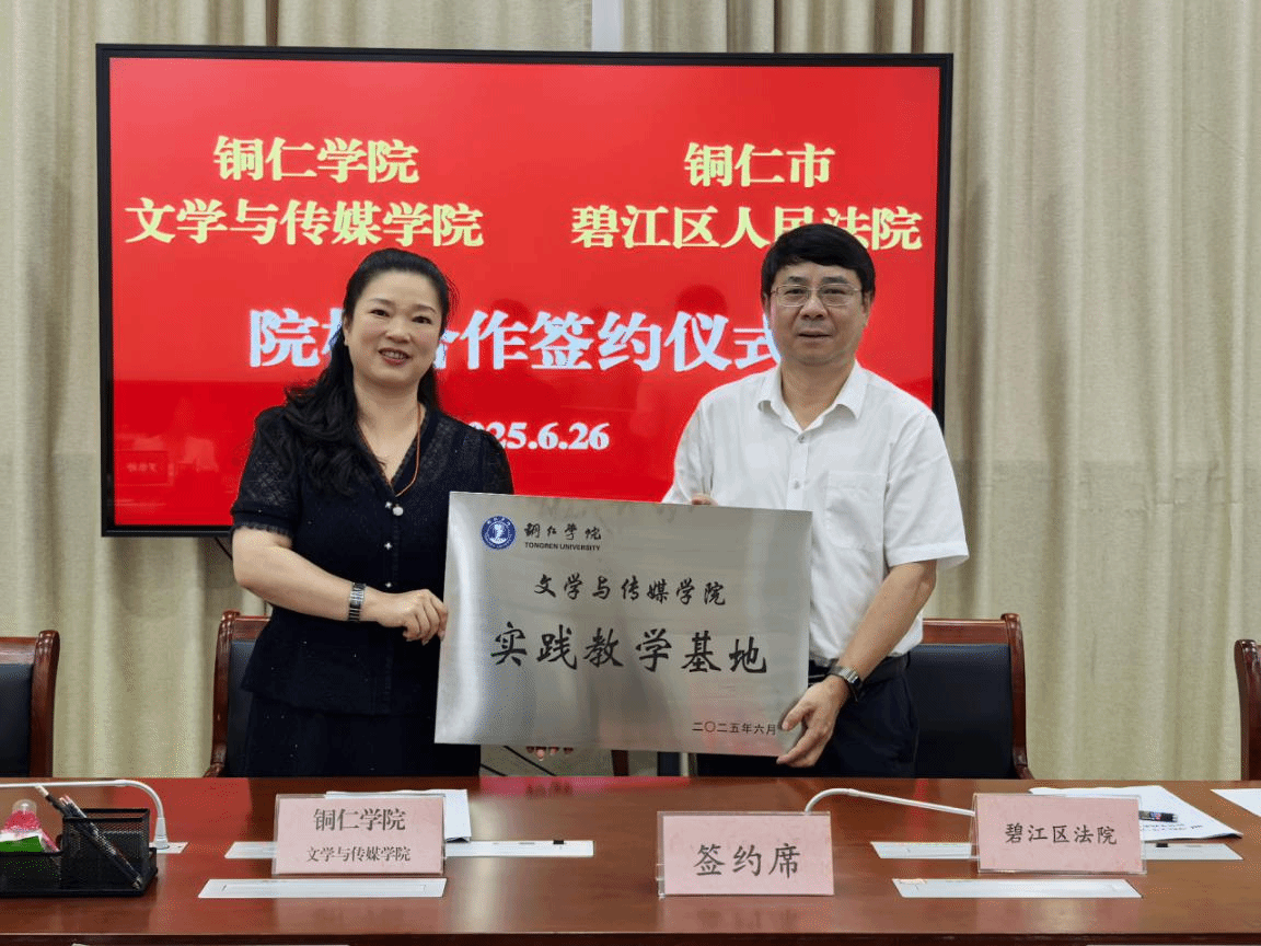 6月26日,我院与碧江区人民法院签订了校外实践教学基地共建协议,并在碧江区人民法院挂牌。碧江区人民法院党组书记、院长毛明生及党组成员、相关业务负责人,我院党委书记杨艳及新闻与传媒系相关业务负责人参加了签约座谈会。