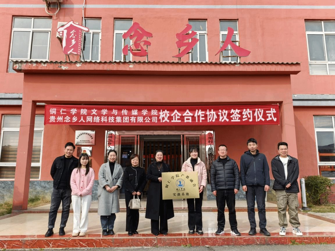 3月19日,bv伟德国际1946文学与传媒学院与贵州念乡人网络科技集团有限公司签署产教融合战略合作协议并挂牌产教融合实训基地。铜仁高新技术开发区组织人事部副部长彭用,贵州念乡人网络科技集团有限公司总经理黄喆及公司相关负责人,文学与传媒学院党委书记杨艳、副院长蒋小红及新闻与传媒系副主任张潇叶、网络与新媒体专业负责人黎帅出席签约仪式。
