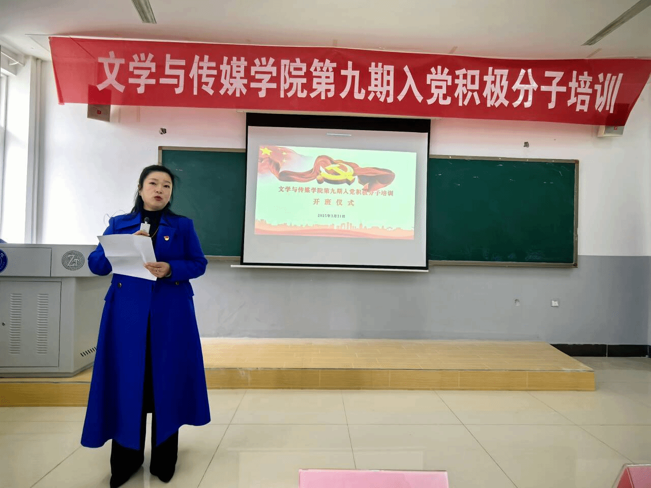 3月31日,文学与传媒学院九期入党积极分子培训开班仪式于依仁楼A402教室举行学院党委书记杨艳、党委副书记杨雪、副院长张建刚、学生党支部负责人杜小霞出席,全体入党积极分子参加。