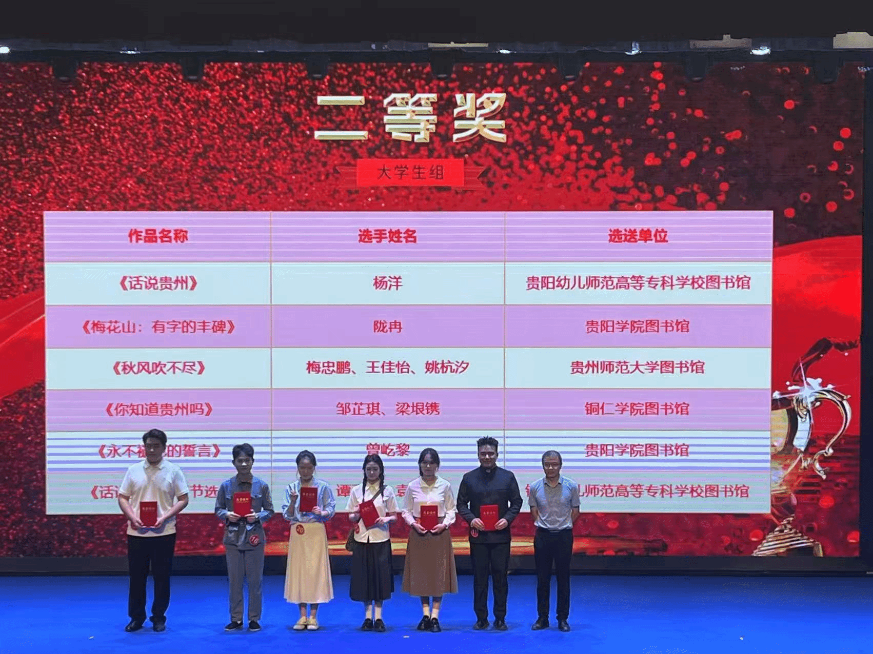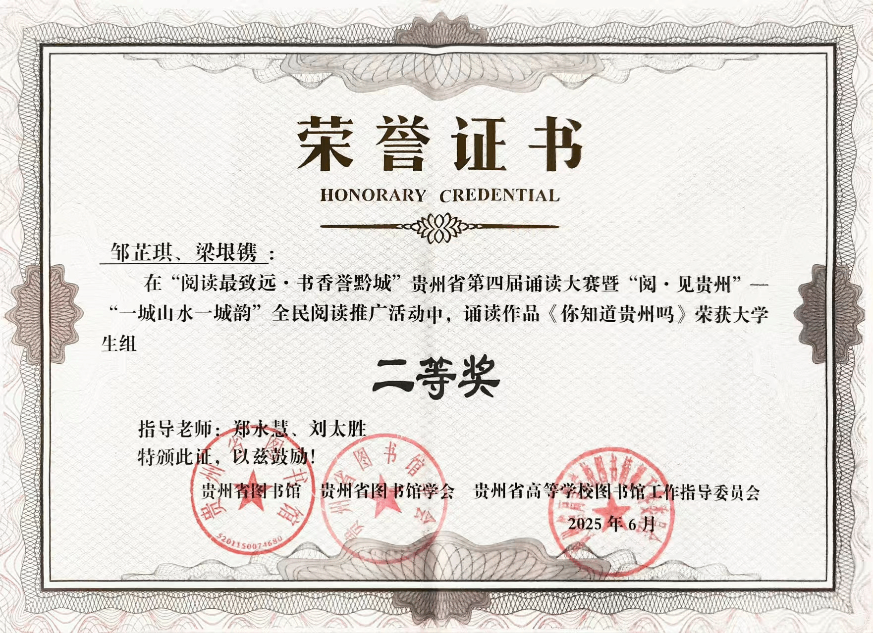在贵州省图书馆主办的“阅读最致远·书香誉黔城”第四届诵读大赛暨“阅·见贵州”全民阅读推广活动中,22级汉语言文学二班邹芷琪同学以声传情、以诵达意,凭借对《你知道贵州吗》一文的精彩演绎,摘得省级二等奖。她以富有感染力的语言艺术,将贵州故事娓娓道来,既展现了深厚的语言表达功底,更传递了对本土文化的深刻理解与热爱。