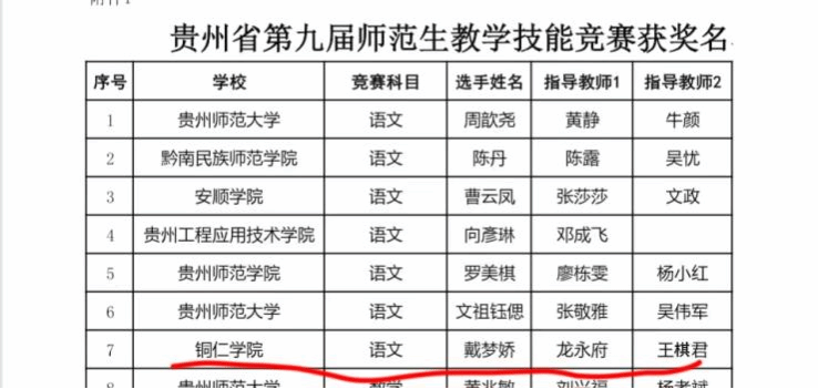 戴梦娇获贵州省第九届师范生教学技能竞赛三等奖公布名单