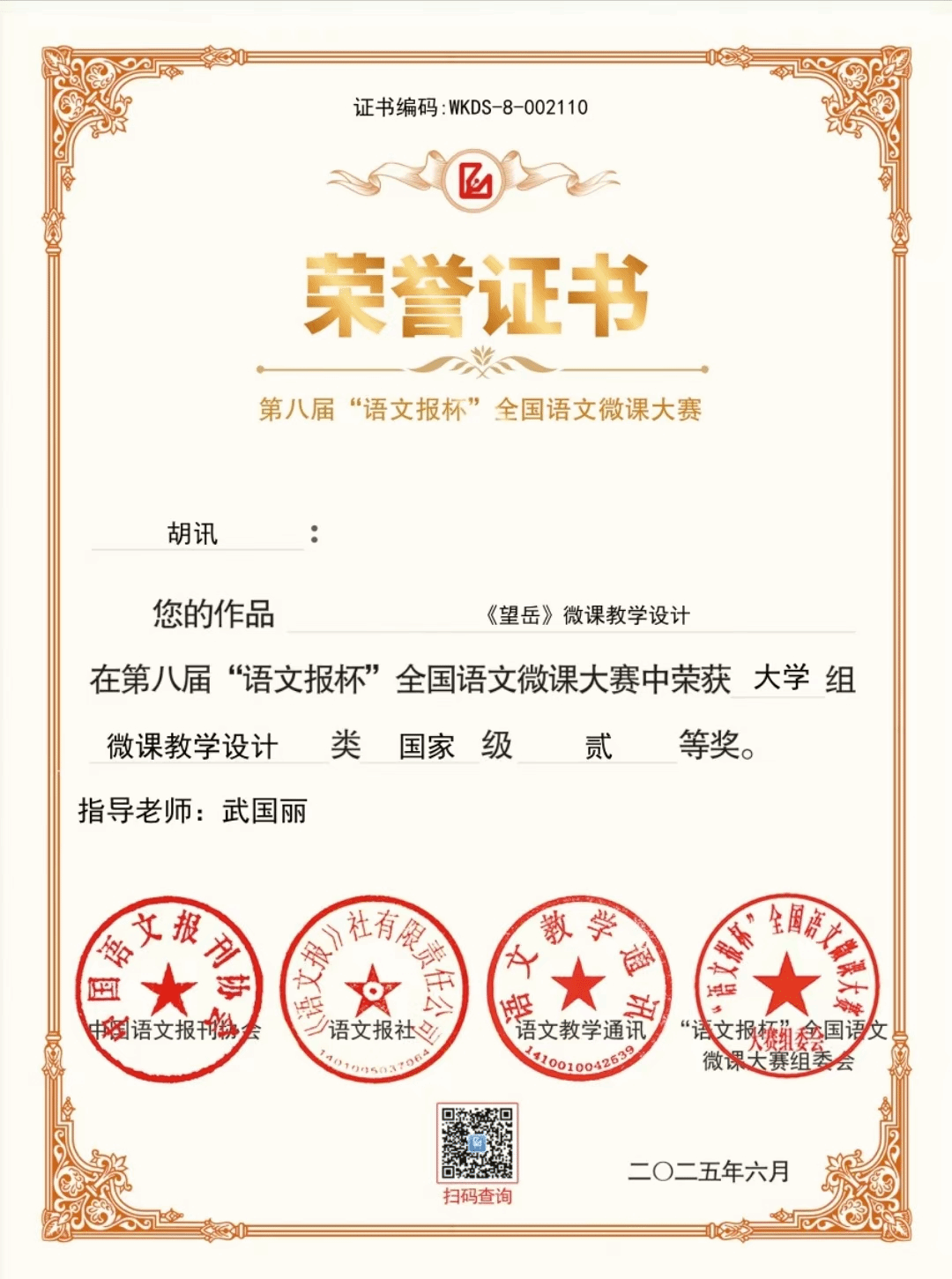 胡迅获微课教学设计类国家级二等奖荣誉证书