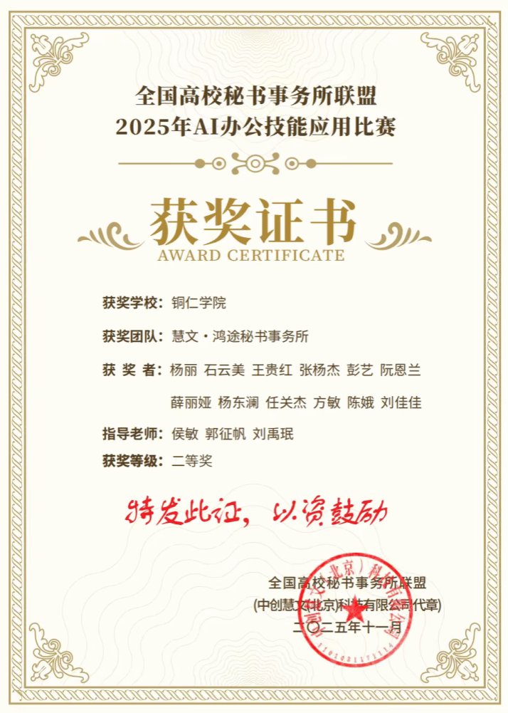 此次获奖不仅是对团队比赛成果的充分肯定,更成为团队成长的重要契机。通过以赛促学,团队成员全面熟练掌握了各类AI办公工具的应用方法,深化了对“AI 赋能秘书工作”的理解,高效提升了将AI技术与文书处理、方案策划等秘书实务相结合的实战能力;在与全国兄弟院校团队的交流中,团队进一步了解了秘书学专业与AI融合的创新思路与实践经验,为后续事务所发展注入了新动能;在备赛过程中的分工协作、难题攻克,更增强了团队的凝聚力与默契度,锤炼了成员的集体荣誉感,为未来参与相关实践项目积累了宝贵经验。