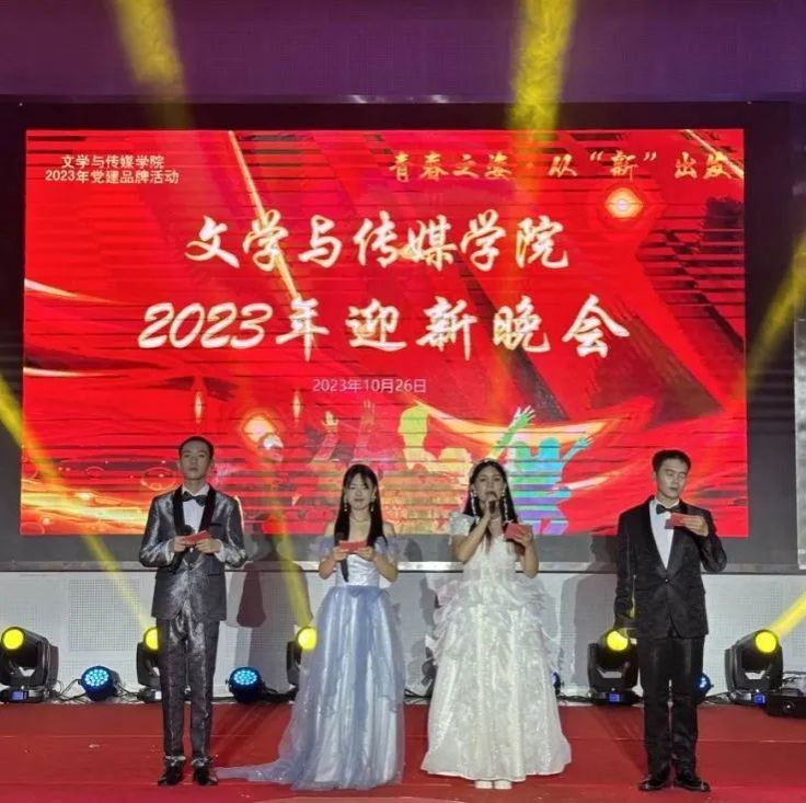 10月26日,文学与传媒学院在bv伟德国际1946人文生态馆举办以“青春之姿·从‘新’出发”为主题的2023年迎新晚会。校党委委员、副校长罗静,校党委委员、组织部部长梁正海,校党委委员、统战部部长刘德平,及部分职能部门主要领导受邀到场观看晚会。