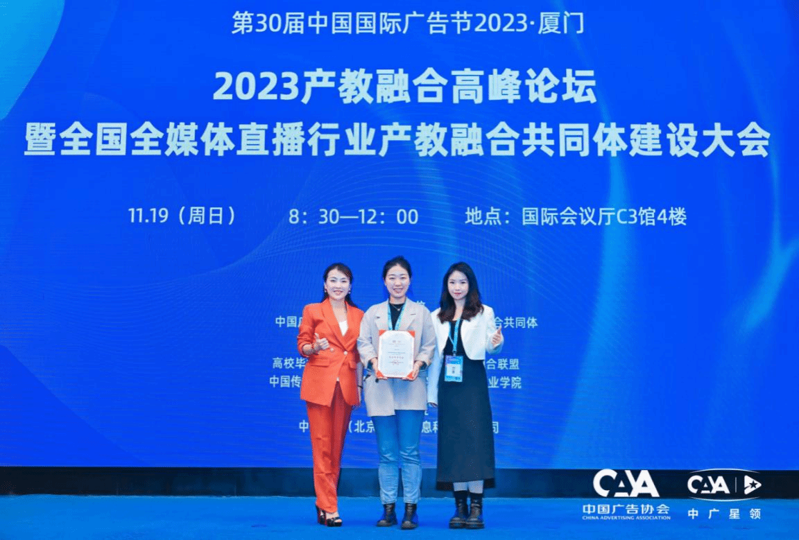 日前,由中国广告协会、全国全媒体直播行业产教融合共同体主办,中广星领(北京)文化信息科技有限公司、中广协产教融合中心承办,高校毕业生就业协会、全国乡村振兴产教融合联盟等单位协办的,2023产教融合高峰论坛暨全国全媒体直播行业产教融合共同体建设大会在厦门召开。文学与传媒学院新闻与传媒系副主任张潇叶、网络与新媒体专业教师杨梦阳应邀参加了本次大会。张潇叶还代表bv伟德国际1946接受了全国全媒体直播行业产教融合共同体常务理事单位聘书。