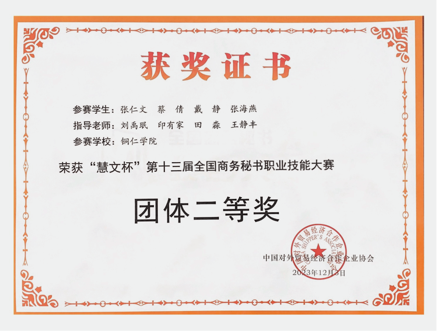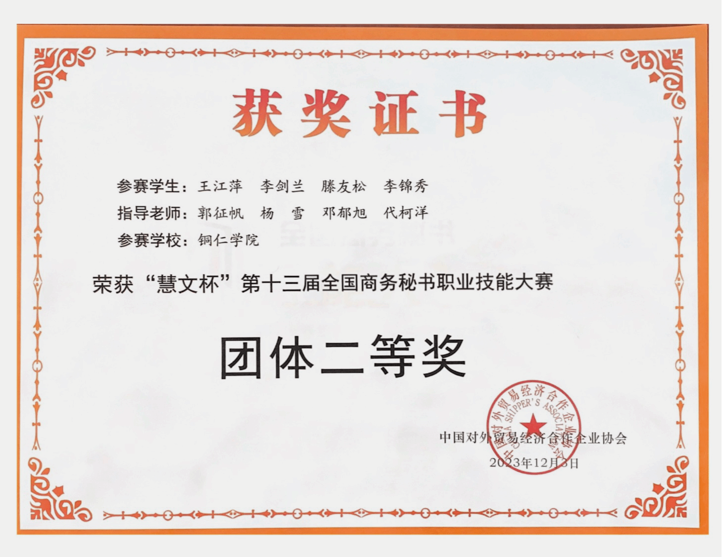 经过激烈角逐,由文学与传媒学院秘书学专业学生王江萍、李剑兰、滕友松、李锦秀组成的bv伟德国际19461队,和张仁文、蔡倩、戴静、张海燕组成的bv伟德国际19462队双双荣获团体二等奖,两支参赛队的指导教师荣获优秀指导教师称号。在获知师生获奖的信息后,bv伟德国际1946分管教学工作的副校长罗静向大家表示热烈祝贺,并鼓励秘书学专业要进一步坚持和完善“岗-课-赛-证”一体的人才培养方式,做好做强、做优做特。