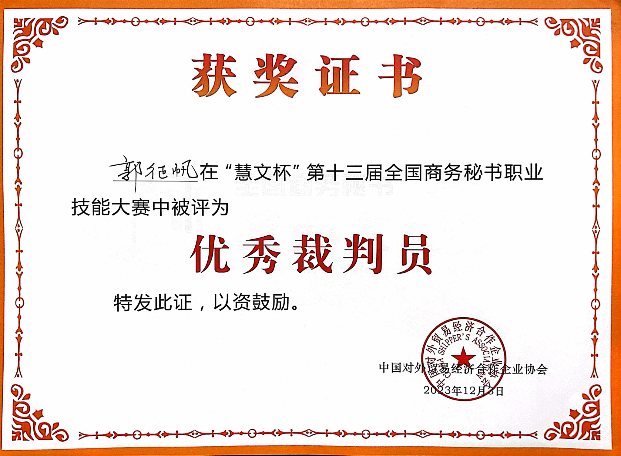 大赛期间,文学与传媒学院秘书学专业负责人郭征帆还被聘请为大赛裁判员,参与了秘书工作情境展示和职业演讲赛项的评判工作,并被评为优秀裁判员。