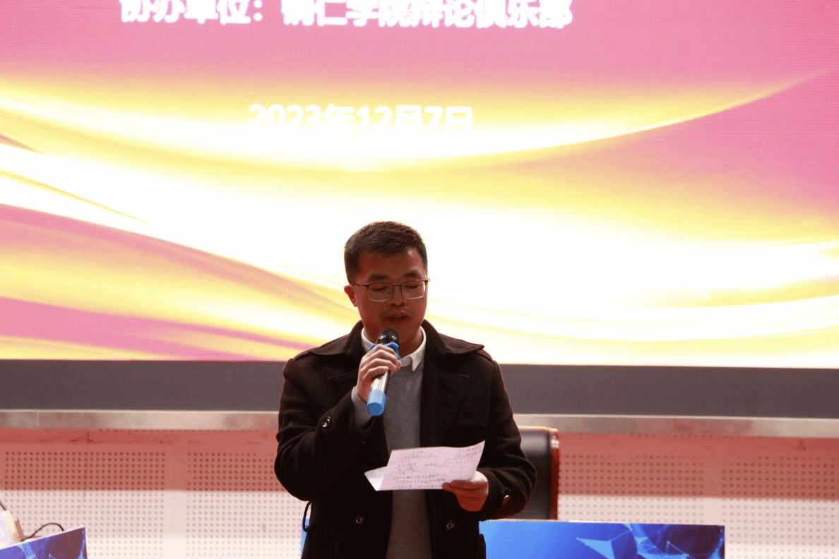 在bv伟德国际1946第三十届“绚丽校园·青春有为”校园文化活动月中,由校团委主办、文学与传媒学院承办的“青春思辨2023”大学生辩论赛决赛于12月7日晚在人文生态馆成功举行。bv伟德国际1946党委宣传部宣传科科长谭钰、教育学院团总支负责人全丹妮、经济管理学院教师代致宇、文学与传媒学院教师龙光海四位老师出席本次活动并担任评委,各院学生代表参加活动,辩论赛由学生欧阳婷主持。