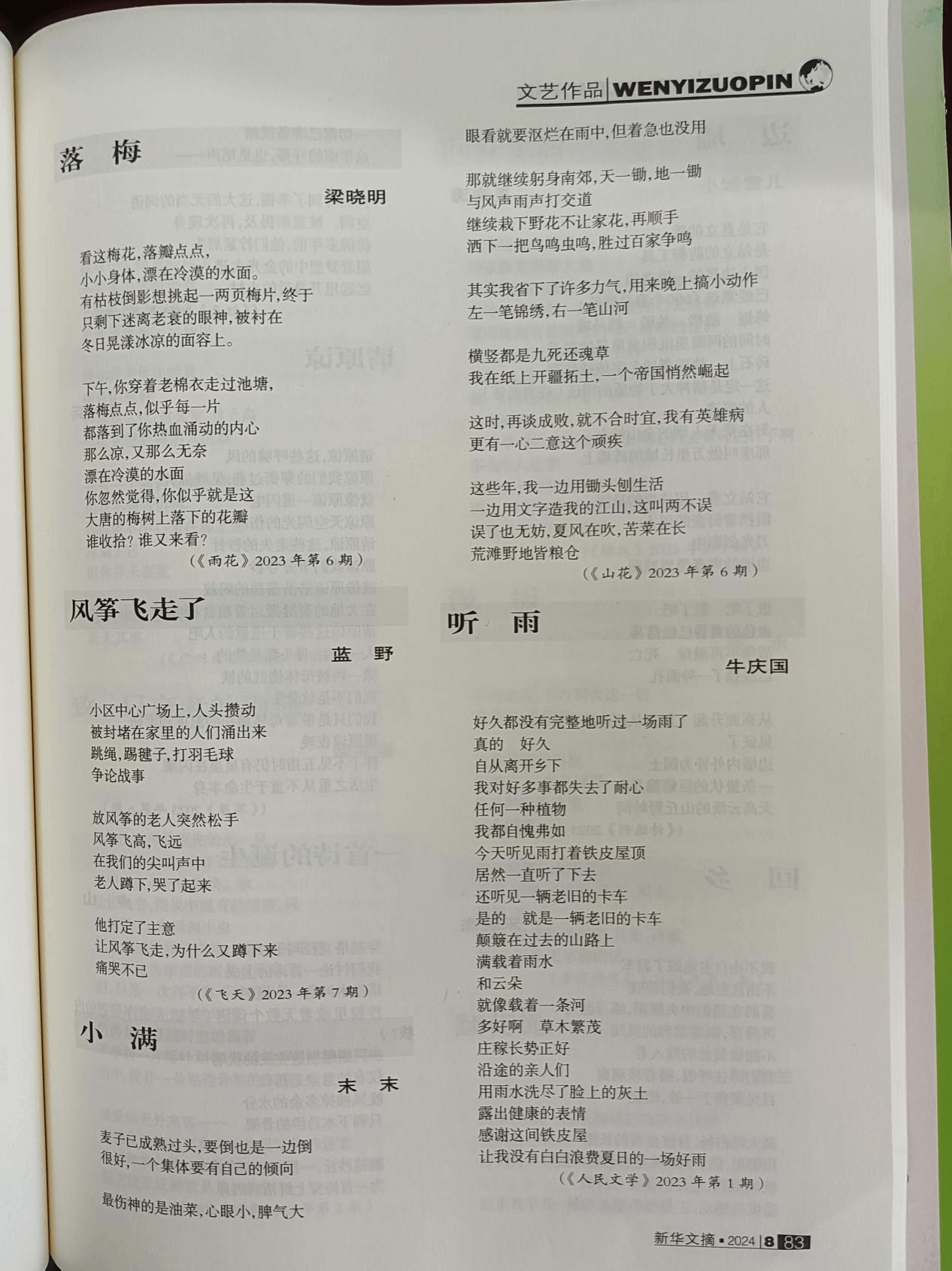 近日,《新华文摘》2024年第8期正式出刊,伟德官网写作研究院教师王晓旭(末未)创作的诗歌《小满》被转载,该诗歌原载《山花》2023年第6期,曾入选《2023中国年度诗歌》(漓江出版社)。这是伟德官网教师的文艺作品继王晖之后第二次荣登《新华文摘》。