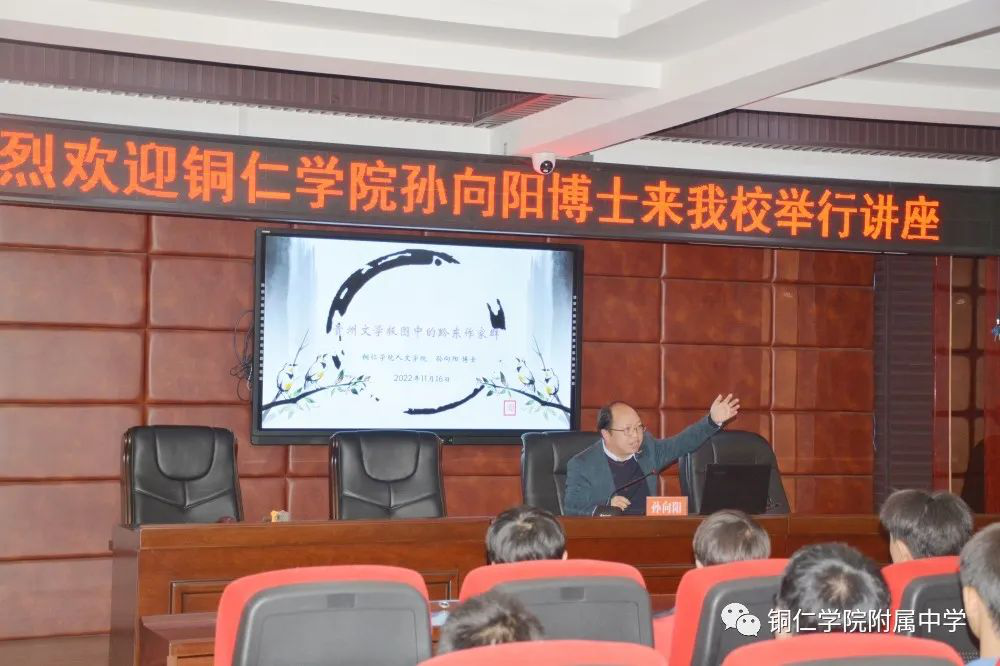 2022年11月16日,我院孙向阳教授为铜院附中的一百余名学生作题目为《贵州文学版图中的黔东作家群》的学术讲座。附属中学校长张江林教授主持。
