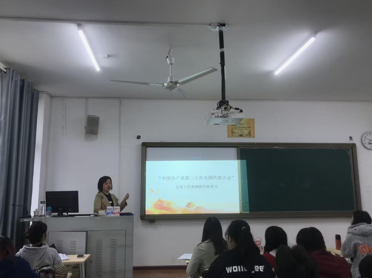 10月28日,2020级秘书学专业在会议策划与组织课程任课教师杨雪老师的组织下,开展了“党的二十大会务工作”会务工作案例研究性学习成果汇报活动。
