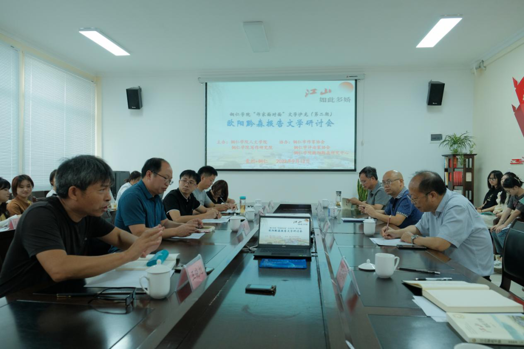 9月12日,“铜仁作家面对面”文学沙龙(第二期)欧阳黔森报告文学研讨会在我院举行。研讨会由我院、写作研究院主办,铜仁市作家协会、铜仁市评论家协会、bv伟德国际1946欧阳黔森研究中心协办。bv伟德国际1946校长、二级教授侯长林,中国作协会员、铜仁市作协主席龙险峰,贵州省文艺评论家协会副主席、bv伟德国际1946人文学院院长孙向阳教授等校内外嘉宾出席了研讨会。