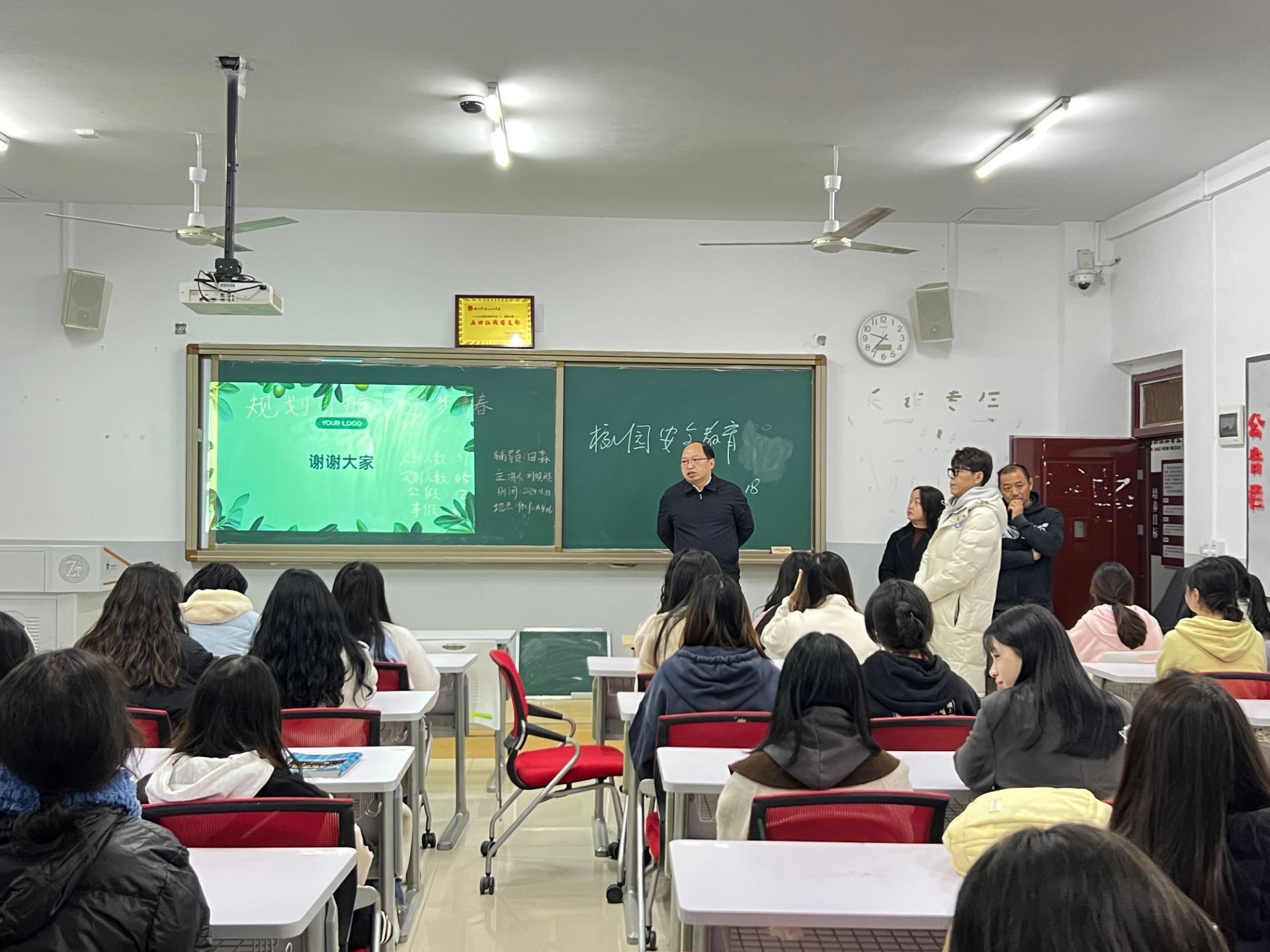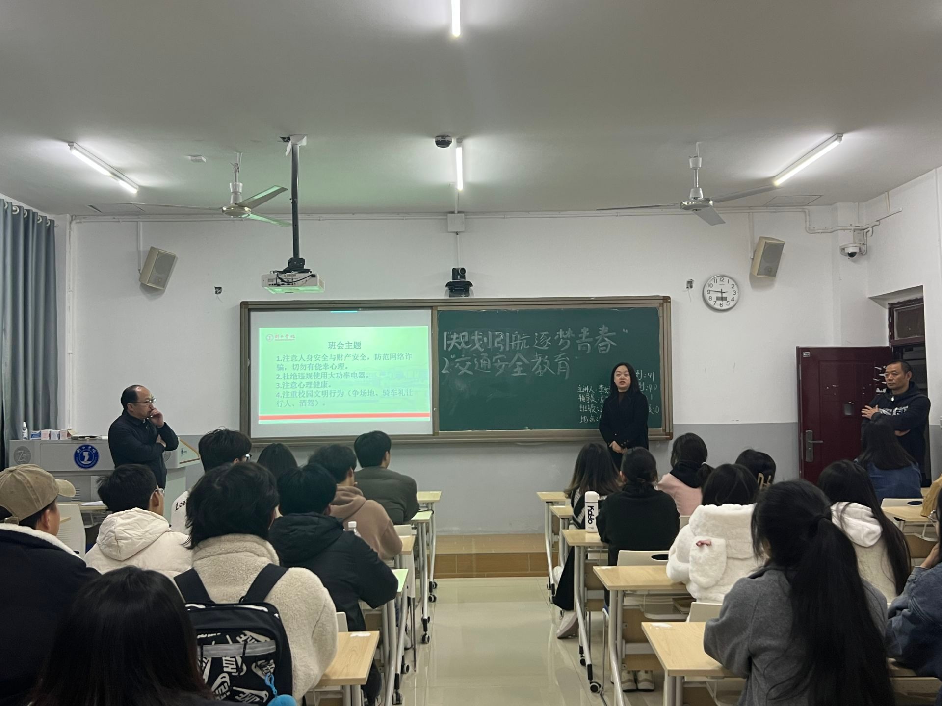 19:00-20:00时,院党委书记院长孙向阳、副书记杨雪、副院长张建刚利用主题班会时间,深入班级,逐班检查各班安全教育开展情况,并进行安全知识宣讲。他们着重强调维护个人及国家安全的重要性,要求同学们切实增强安全意识与自我保护本领,为构建平安校园奠定坚实基础。