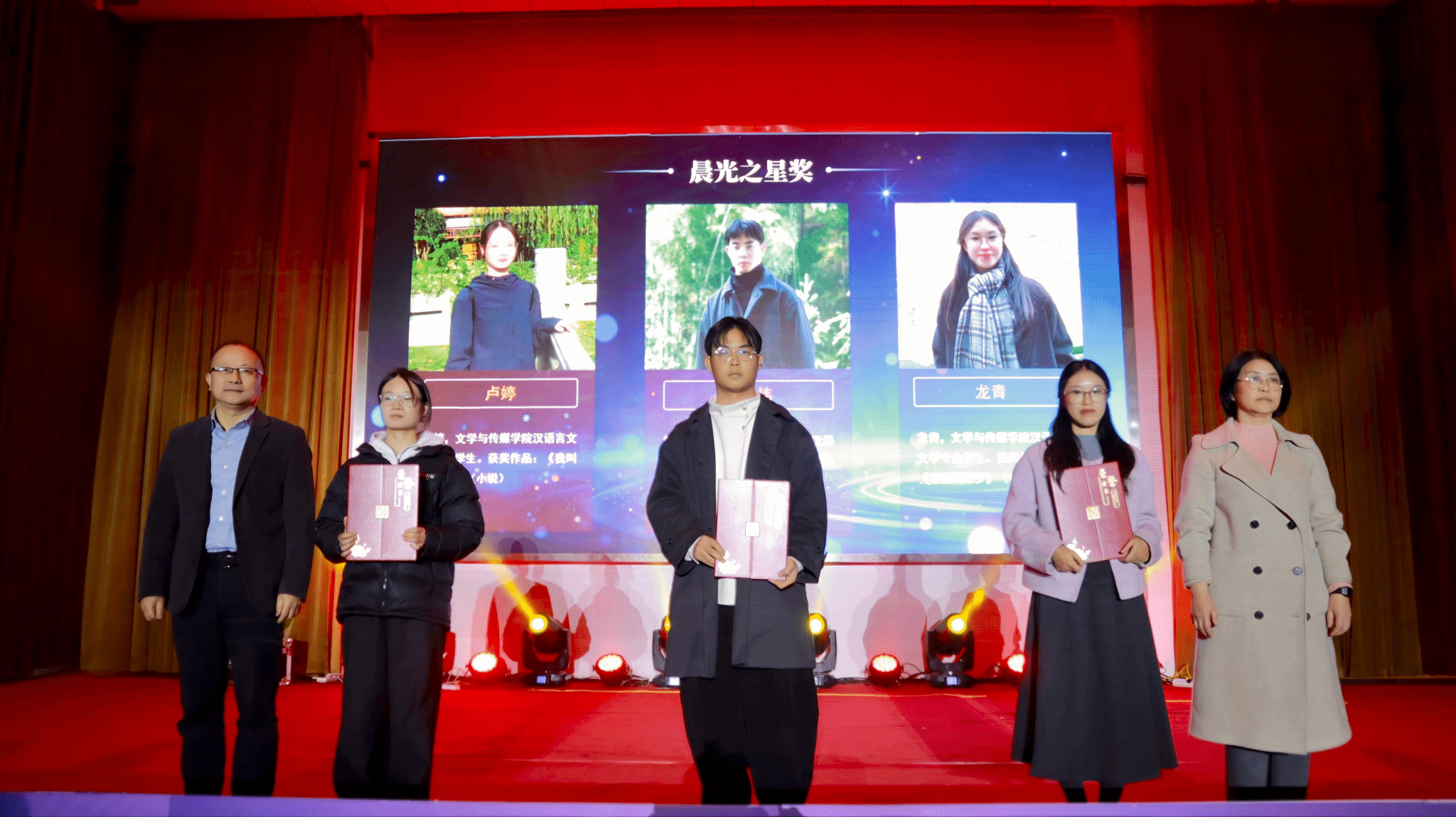 本届奖项共评选出“晨光之星奖”与“优秀作品奖”。卢婷《我叫李阳光》、蒋振炜《山居帖》(组诗)、龙青《老旦的除夕》获“晨光之星奖”;另有5位同学牟群《重寻记号》、温颖异《观喜》、杨湘《别说以后》、王丹春《许愿者(二首)》、刘莎莎《尖刺》获“优秀作品奖”。作品题材涵盖市井生活、青春成长等多元主题,校领导与嘉宾逐一为获奖学子颁发证书并祝贺。