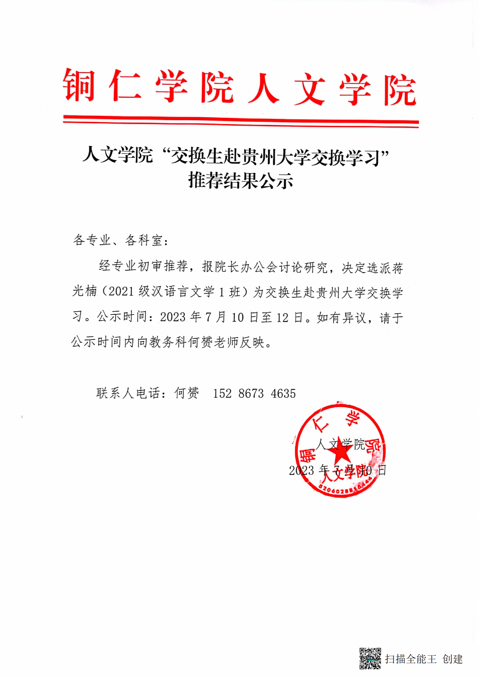 人文学院“交换生赴贵州大学交换学习” 推荐结果公示