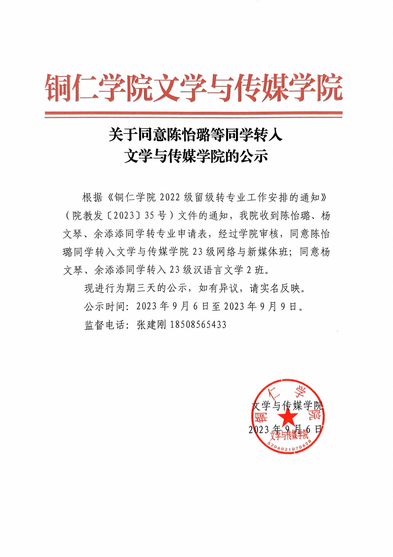 关于同意陈怡璐等同学转入文学与传媒学院的公示