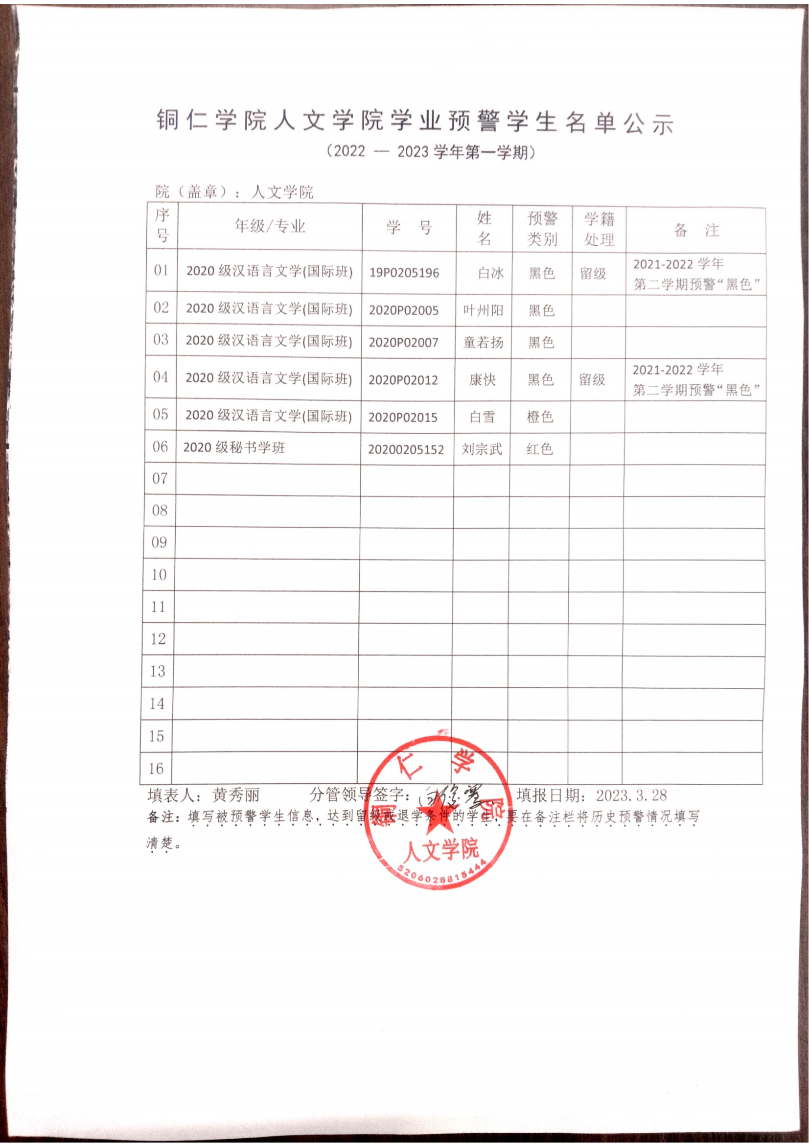 bv伟德国际1946人文学院学业预警学生名单公示 (2022 — 2023学年第一学期)