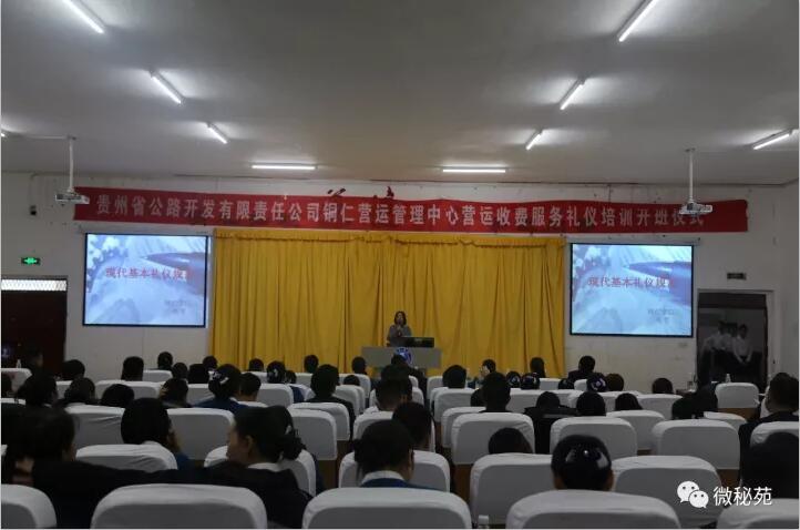 11月16日上午,贵州省公路开发有限责任公司铜仁营运管理中心员工营运收费服务培训班在bv伟德国际1946博思楼206教室举行开班仪式,仪式过后即举行了礼仪知识培训。培训旨在进一步规范员工礼仪,提升个人修养及岗位意识,提高工作能力及服务水平,塑造良好企业形象。秘书学教研室教师、全国商务秘书职业技能大赛评委杨雪为培训班140余名学员授课。