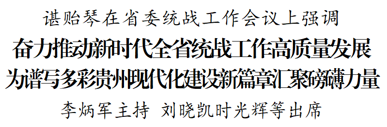 谌贻琴强调,统战工作的本质要求是大团结大联合,要牢牢把握固守圆心和扩大共识、潜绩和显绩、原则性和灵活性、团结和斗争的关系,团结一切可以团结的力量,调动一切可以调动的积极因素,奋力开创我省统战工作新局面。要深入落实我国社会主义新型政党制度,坚持党的领导,强化政治引领,完善制度机制,推动新时代多党合作更加规范有序、生动活泼。要全面推进中华民族共有精神家园建设,加快建设铸牢中华民族共同体意识模范省,坚持我国宗教中国化方向,深入推进我国宗教中国化的贵州实践。要不断加强党外知识分子和新的社会阶层人士统战工作,深化政治引领、价值观引领、事业引领,鼓励支持他们立足本职建功立业,积极投身改革创新一线,施展才华和抱负。要促进非公有制经济健康发展和非公有制经济人士健康成长,深入开展理想信念教育和社会主义核心价值观教育,全面构建亲清政商关系,优化民营企业发展环境,促进民营经济高质量发展。要扎实做好港澳台海外统战工作和侨务工作,形成更广泛的国内外支持“一国两制”的统一战线。要高度重视做好网络统战工作,走好网络群众路线。