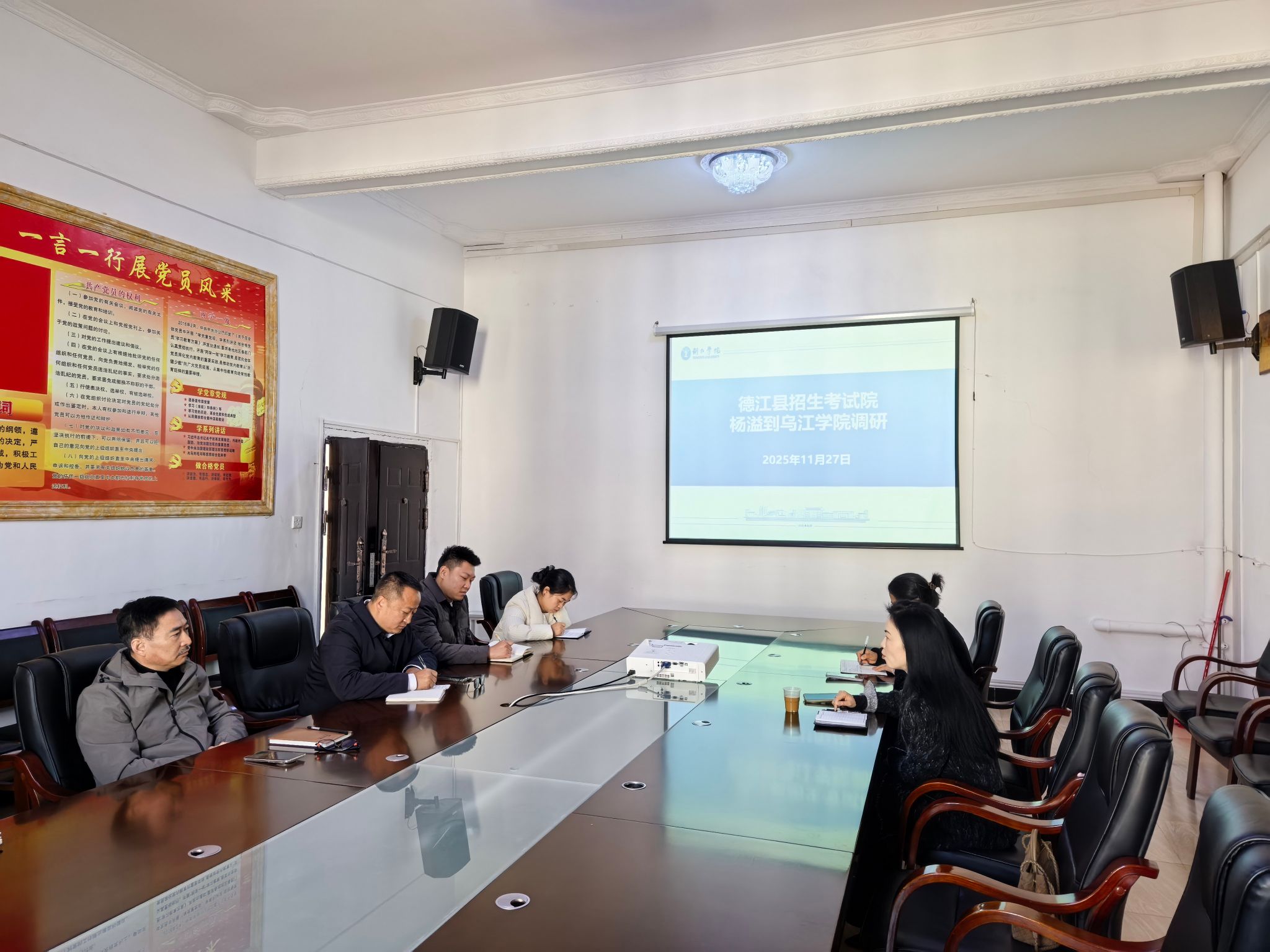11月27日,德江县招生考试院杨溢院长一行到乌江学院,就德江县研学点规划与特色课程开发工作进行专题调研。乌江学院副院长李念(主持工作)、王红兵,全体教职工参加调研会议。