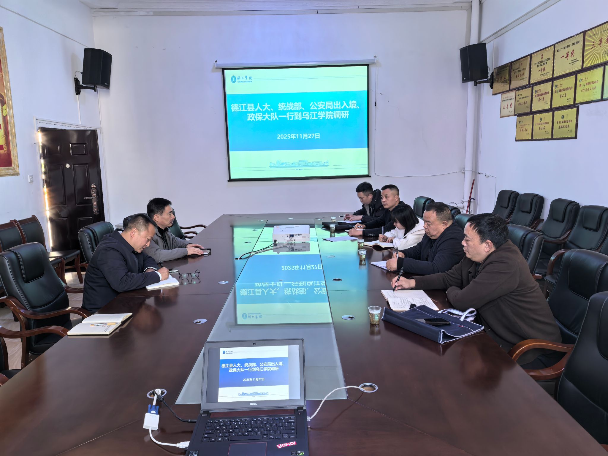 为进一步加强校地协同,筑牢校园安全防线,2025年11月27日,德江县人大常委会、县委统战部、县公安局出入境管理大队、国内安全保卫大队等部门联合调研组莅临乌江学院,就学生安全相关工作进行了专题调研。乌江学院副院长李念(主持工作)、王红兵陪同并参加座谈会。
