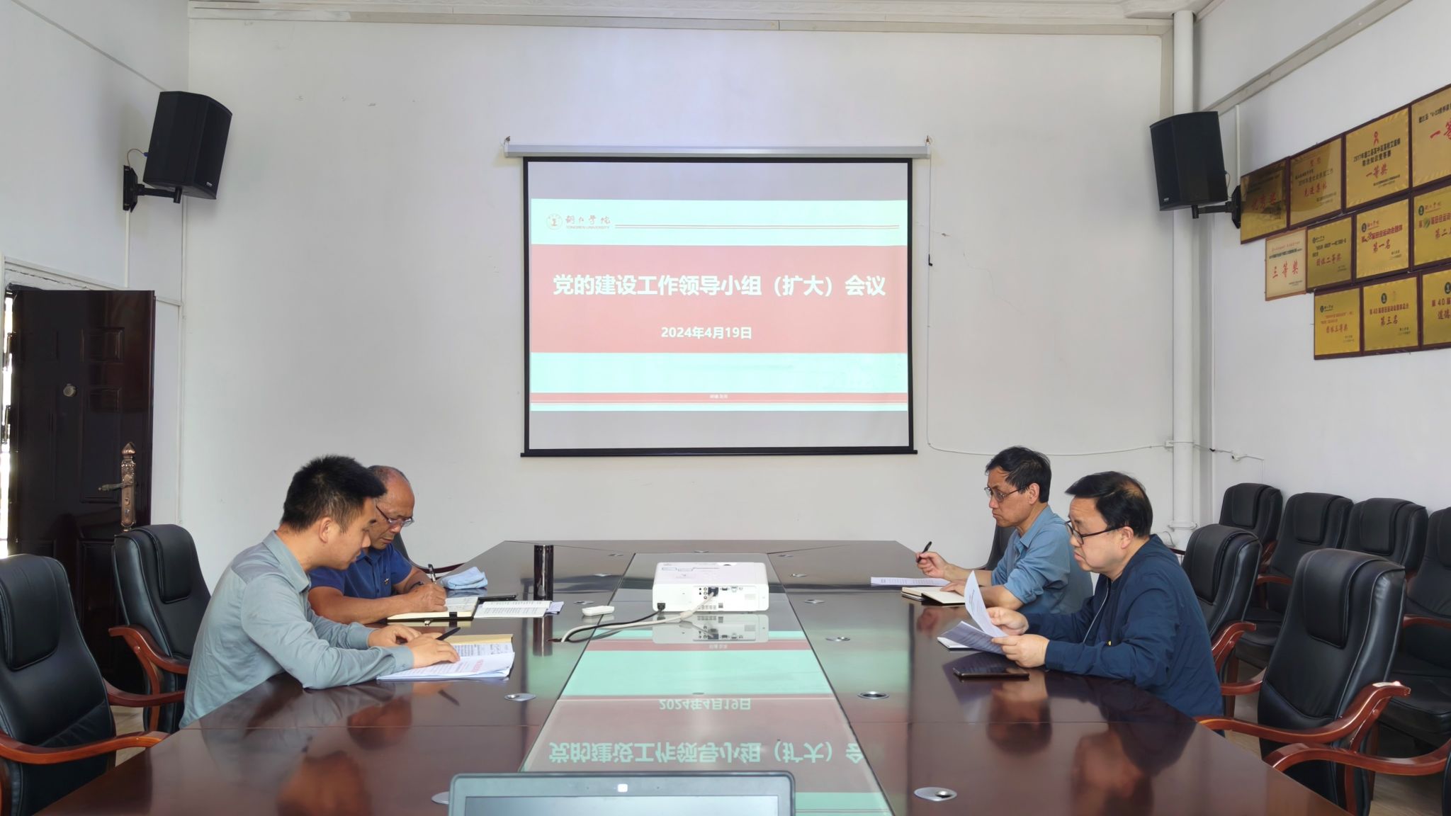 4月19日,我院召开党的建设工作领导小组(扩大)会议,会议由党总支书记邓崇权主持,党总支副书记、院长张敬忠传达中央、省委、学校党委有关文件、会议精神,党政办周源泉解读《中共bv伟德国际1946乌江学院总支部委员会关于开展党纪学习教育的实施方案》,学院党政班子及各科室负责人参加会议。