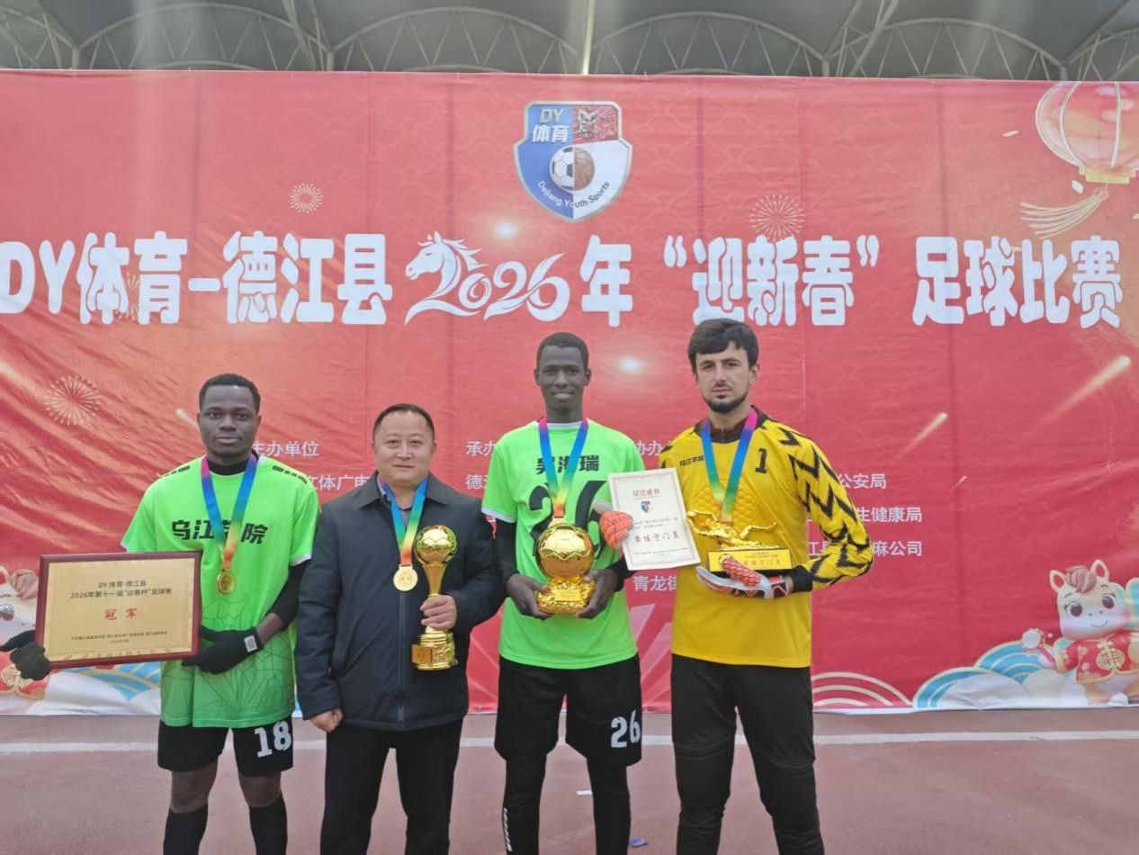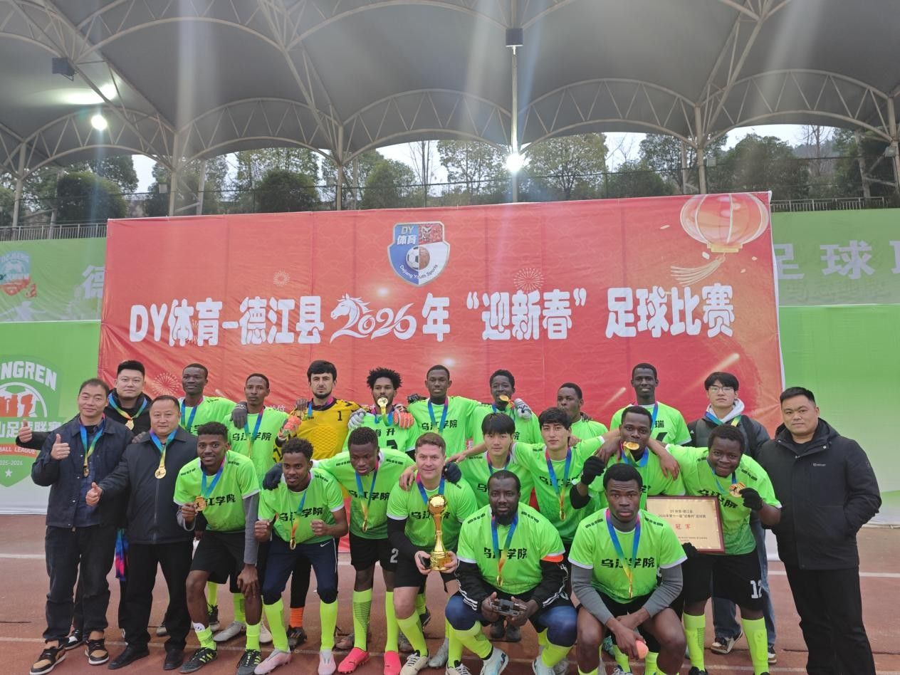 2月9日,DY体育——德江县2026年“迎新春”足球比赛圆满落幕。经过多轮激烈角逐,乌江学院留学生足球队凭借默契配合与过硬实力,成功斩获本次赛事冠军,以足球为媒,展现了国际学子昂扬向上的精神风貌,为新春佳节增添了热血与活力。