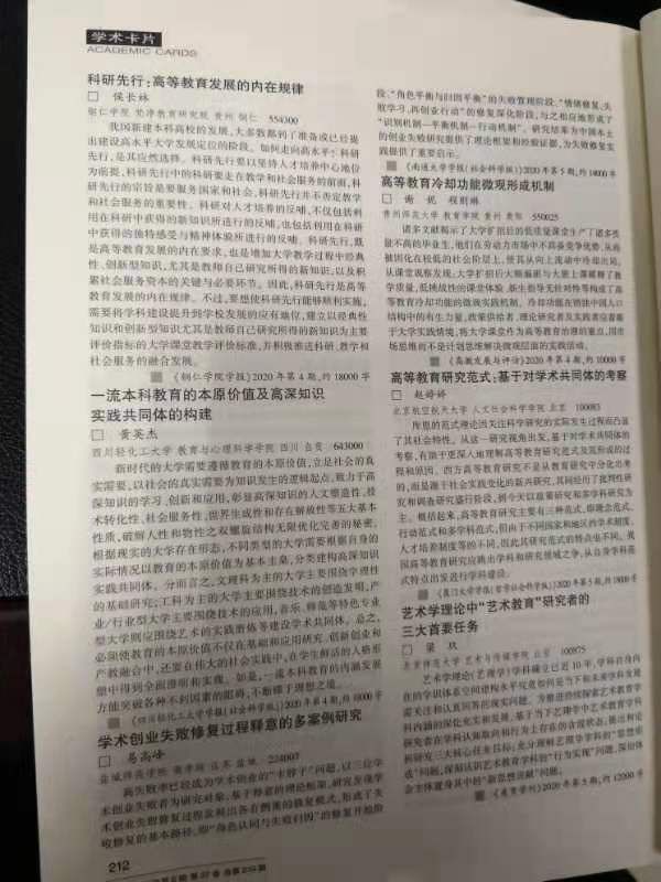 《科研先行:高等教育发展的内在规律——兼论教学、科研和社会服务的关系》一文被《高等学校文科学术文摘》2020年第6期论点摘编