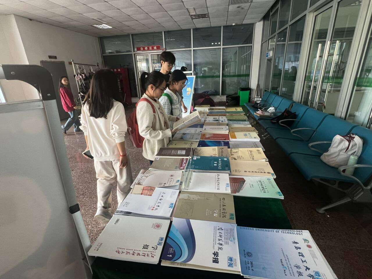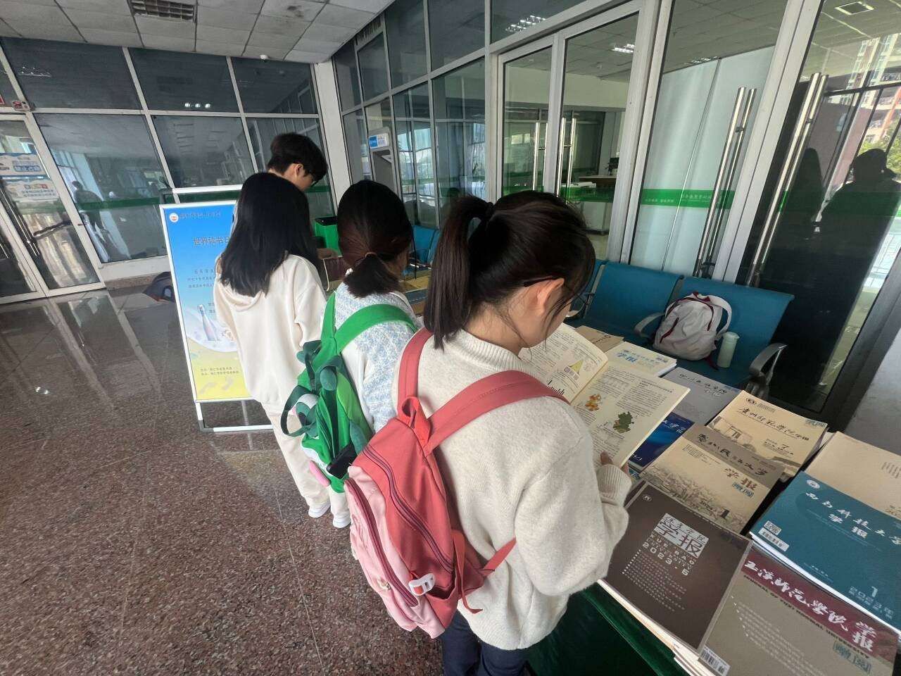 读者们纷纷驻足“漂流站”,认真挑选阅读心仪的期刊