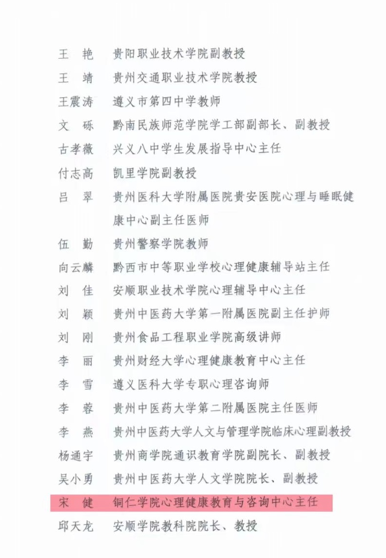 近日,贵州省委教育工委、贵州省教育厅发布《关于成立贵州省学生心理健康教育专家指导委员会的通知》,伟德官网宋健等三位教师当选为贵州省学生心理健康教育专家指导委员会委员。