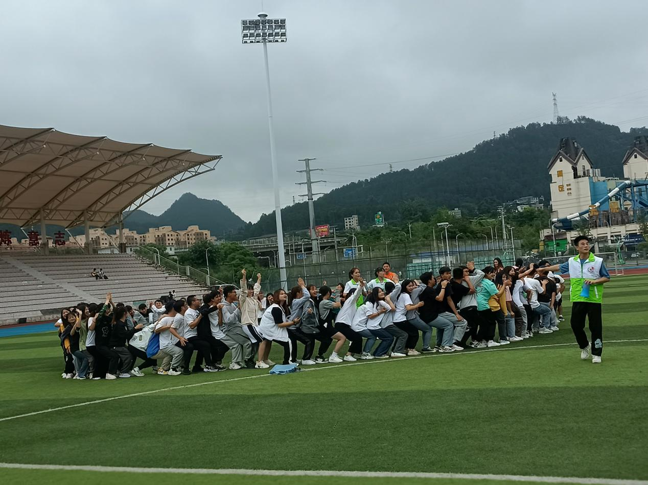 第二个环节是“坐人椅”,每个小组围成圈,然后前一个同学坐在后一个同学的腿上,依次下去,不仅要坐的很稳固,而且各个组还需要唱自己的组歌,坚持到最后的队伍获胜。这个环节锻炼的是大家的社交适应和团结的能力,在互不相识的情况下,大家需要一来起完成这个任务,每一个同学都很努力坚持和信任自己的队友。他们都满怀激情的唱着自己队伍的组歌,一声更比一声高。田径场上回荡着同学们激昂的歌声,每个人都在为同一个目标而坚持努力着。