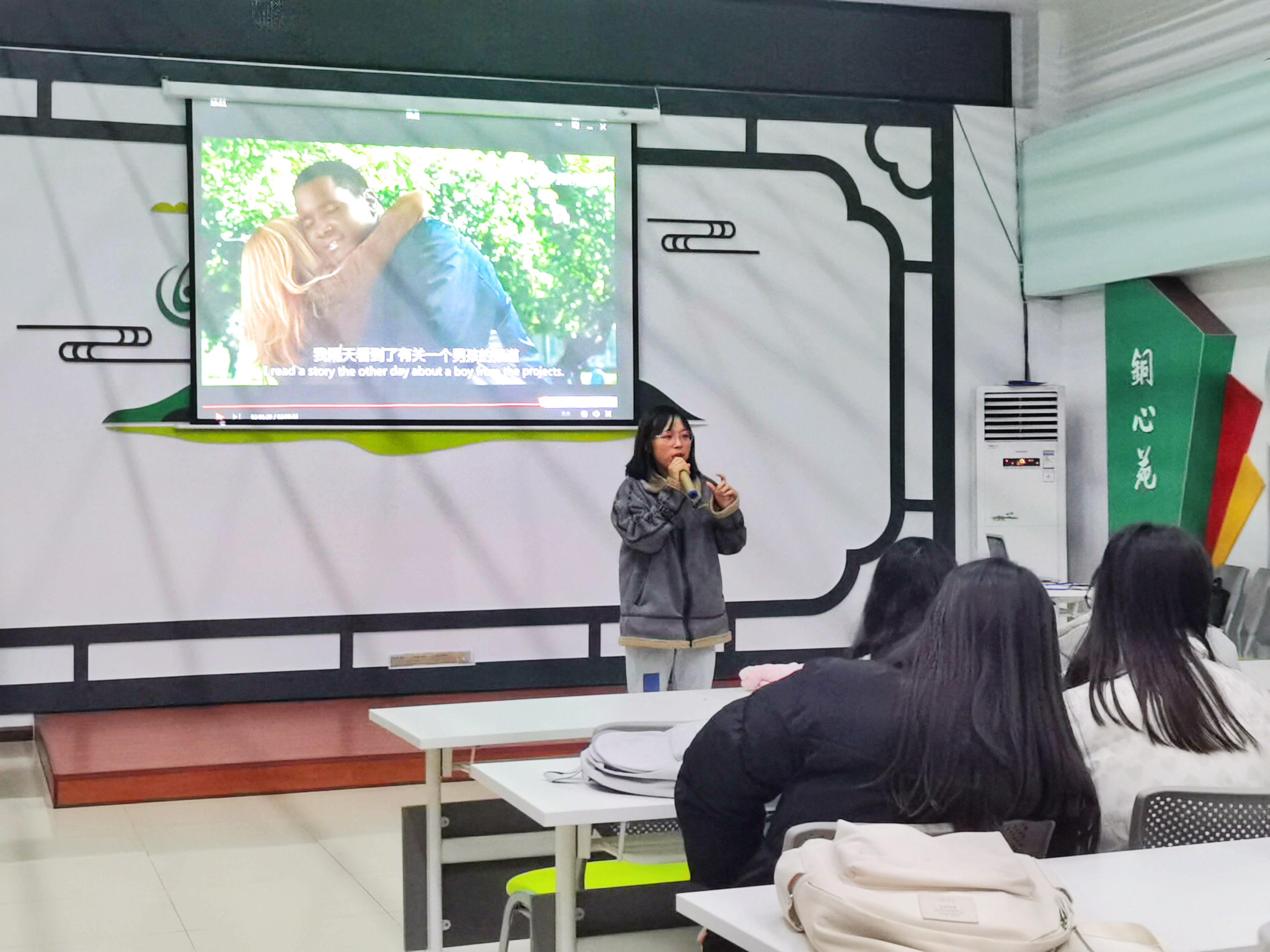 接着,分享者为大家播放电影《弱点》。整部电影大约持续120分钟。影片讲述了一个无家可归的非洲裔男孩迈克尔·奥赫从小就是一个孤儿,一再的从领养家庭中逃走后终于遇上了好心的陶西太太,而在后者的帮助下,迈克尔·奥赫逐渐的找到了自我,在自己的身体条件与刻苦锻炼下,他终于成为了美国国家橄榄球联盟的首批被选球员。在播放过程中,大家非常认真的观看了整部电影。
