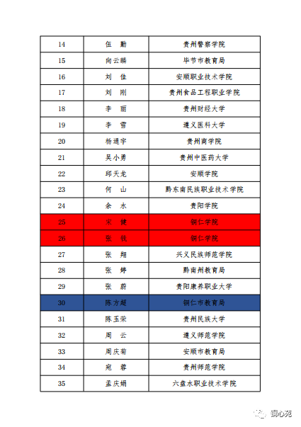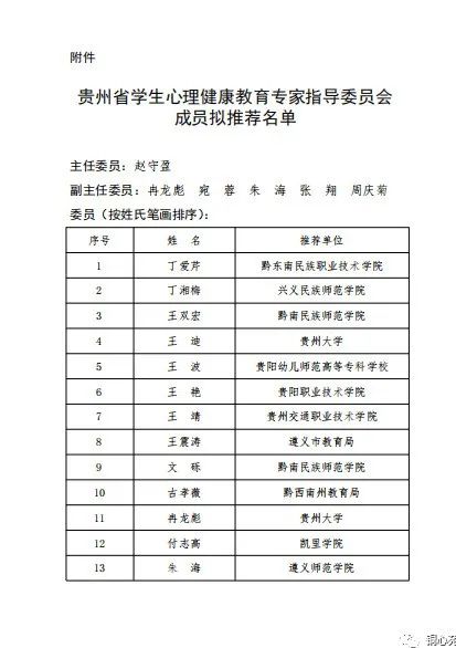 4月11日,贵州省教育厅发布了《省教育厅关于贵州省学生心理健康教育专家指导委员会成员拟推荐名单的公示》,根据《省教育厅办公室关于推荐贵州省学生心理健康教育专家指导委员会成员的通知》要求,经学校推荐,专家推选,拟推荐贵州师范大学赵守盈、贵州大学冉龙彪等54位同志为贵州省学生心理健康教育专家指导委员会成员,拟推荐赵守盈同志担任主任委员,冉龙彪、宛蓉、朱海、张翔、周庆菊等5位同志担任副主任委员。伟德官网心理健康教育中心主任宋健、学工部部长张钱入选,另外伟德官网大健康学院教师陈方超作为铜仁市教育局专家入选。