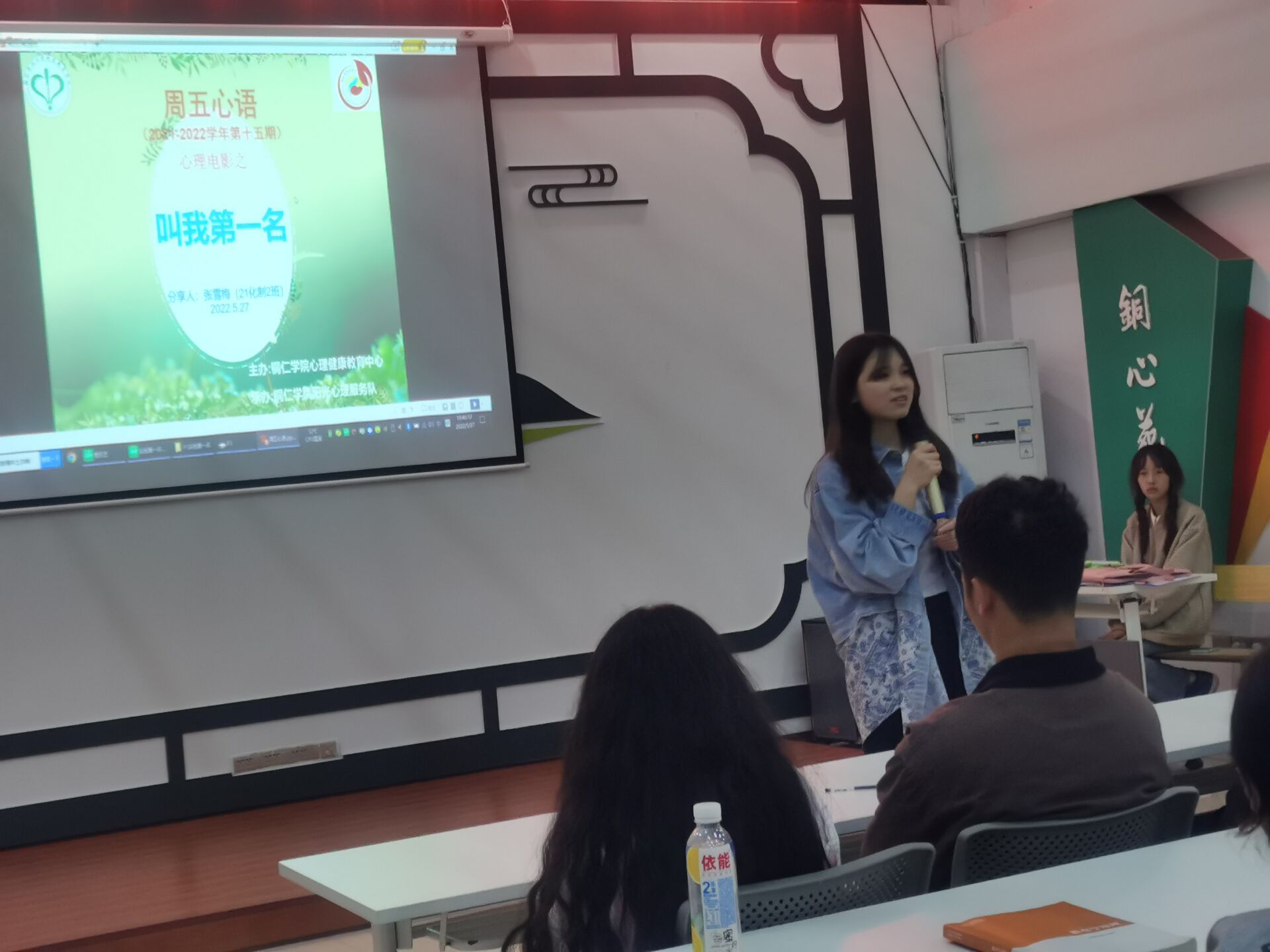5月27日晚,伟德官网在心理健康教育中心多功能室开展了本学年第十四期周五心语活动——心理电影赏析之《叫我第一名》。此次活动由2021级化工与制药2班的张雪梅同学主持分享,来自不同学院的50名同学共同参与。