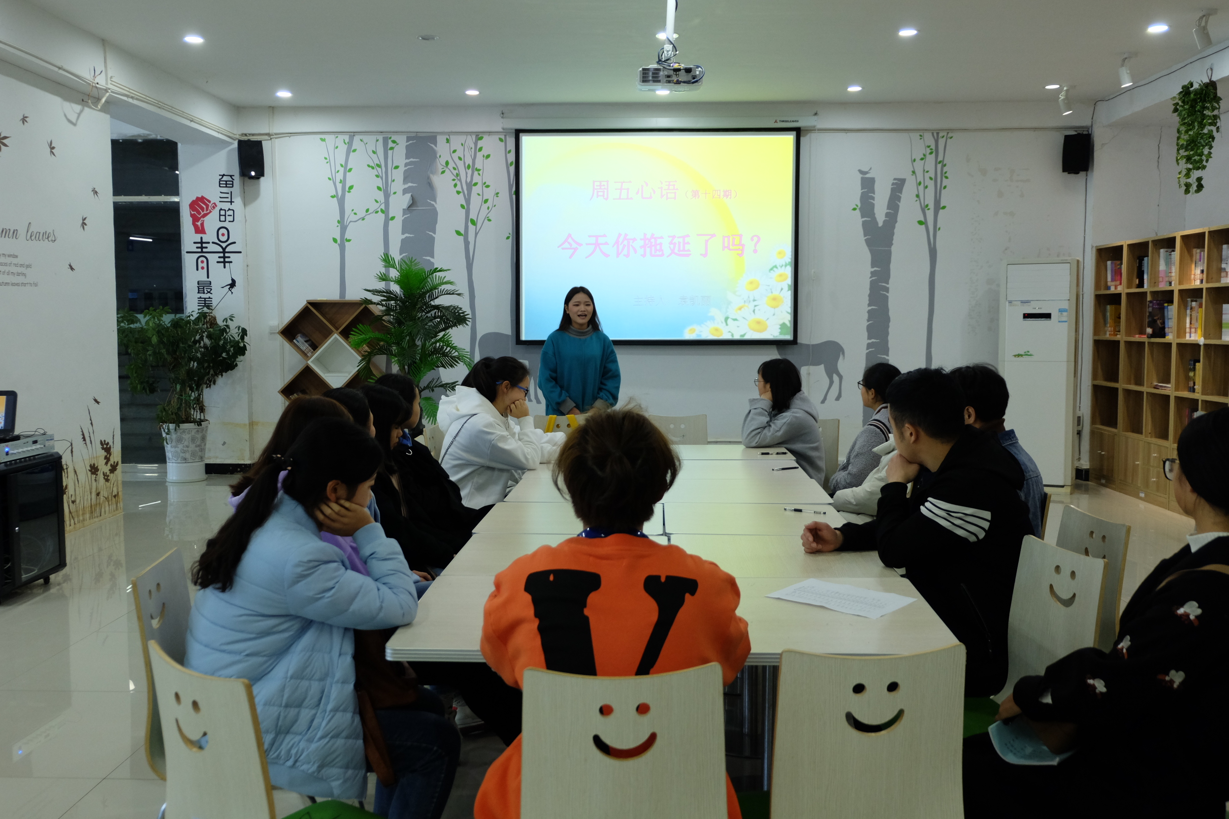 11月23日bv伟德国际1946心理协会在学生事务服务中心举行第十四期周五心语活动,主题围绕“今天你拖延了吗?”展开讨论,此活动由宣传部袁凯丽主持。来自不同学院的20名同学共同参与完成。